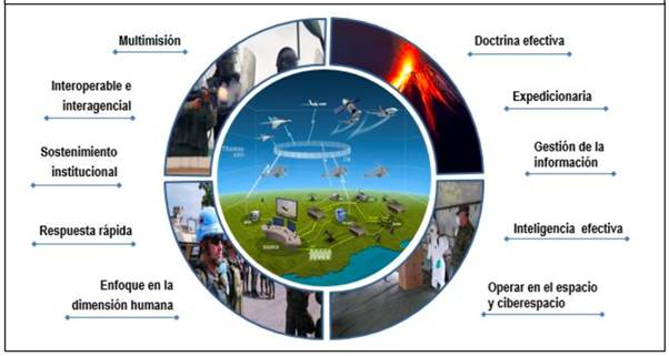 Este diseño de fuerza debe contribuir al desarrollo de capacidades mediante el análisis del MIRADO y considerando las capacidades militares futuras expuestas en la Figura 11. Capacidades militares futuras.