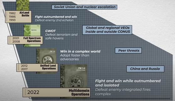 Paralelamente a lo descrito, la doctrina ha evolucionado para responder a las preguntas recurrentes de la sociedad en cada época de conflicto. Un ejemplo de esto es la evolución de la doctrina de operaciones del Ejército de los EE. UU., específicamente en el manual de campo FM 3-0, como se muestra en Figura 3. Evolución de la doctrina de operaciones. Se infiere, por lo tanto, que las operaciones multidominio implican el empleo combinado de las capacidades conjuntas de los SOCB de las Fuerzas Armadas. Este enfoque busca crear y explotar ventajas para alcanzar los objetivos y derrotar a las fuerzas opuestas con la mayor eficiencia en las operaciones.