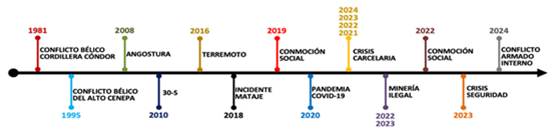 En Ecuador, después del conflicto del Cenepa en 1995, se mantuvieron las misiones constitucionales enmarcadas en cuatro campos: la defensa de la soberanía e integridad territorial, el apoyo a la acción del estado, el apoyo al desarrollo nacional y la cooperación internacional. Sin embargo, la naturaleza del conflicto fue cambiando, como se observa en Figura 6. Modificación de la Naturaleza del Conflicto en el caso de Ecuador. El enfoque pasó de ser interestatal con amenazas simétricas, con balance de poder y teniendo al estado como blanco principal, a un conflicto intraestatal con amenazas asimétricas, actores no estatales y la población civil como blanco principal; finalmente se llegó a los conflictos intermésticos, donde los oponentes son grupos terroristas, el crimen organizado, el narcotráfico entre otros. De esta manera, el tipo, la cantidad y el alcance de las operaciones de Fuerzas Armadas han ido cambiando en el tiempo hasta llegar a ocupar hoy en día, el mayor esfuerzo del ejército, en las operaciones de ámbito interno, como se puede observar en la Figura 7.
